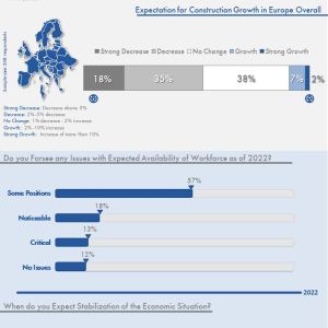 Circa 53% dintre managerii din industria constructiilor cred ca volumul lucrarilor in Europa va scadea in 2022 si 2023. In schimb, doar 9% sunt optimisti si considera ca industria de profil va creste, potrivit unui studiu recent realizat de Interconnection Consulting, din Viena. Doua treimi din cei 208 manageri ai firmelor de executie si de productie a materialelor de constructii chestionati in Europa nu se asteapta ca sectorul sa se stabilizeze sau sa se normalizeze pana in 2024. Anul acesta, 67% dintre expertii chestionati se asteapta la cresteri ale costurilor cu 30% sau chiar mai mult. De asemenea, o treime dintre expertii chestionati afirma ca inca din 2022 se va inregistra o majorare cu peste 50% a cheltuielilor de intrare. De asemenea, specialistii din domeniu nu sunt deloc increzatori ca vor putea transfera in intregime cheltuielile sporite in preturi. 55% dintre respondenti considera ca preturile de vanzare nu vor creste cu mai mult de 25% in acest an, iar un sfert dintre respondenti considera ca avansul va fi de cel mult 15%. Lipsa de forta calificata de munca, care provoaca probleme majore pentru tot mai multe companii din Europa, este un punct de maxim interes pentru companii, alaturi de cresterea preturilor. Pentru o treime dintre manageri, deficitul de forta de munca este o problema recunoscuta, 13% dintre companiile chestionate afirmand ca aceasta este critica, cu efect direct asupra termenelor de livrare a comenzilor. Exista insa si un grup de 12% dintre firmele intervievate ai caror oficiali declara ca nu au probleme cu muncitorii calificati. In ceea ce priveste salariile, pe termen scurt este posibil ca acestea sa se majoreze cu 8 – 12%, in viziunea a 50% dintre cei care au participat la studiu. Sporurile depind in mod direct de inflatia regionala, a carei rata in UE a fost de 10,1%, in luna august. Pentru informatii suplimentare, click aiciABONARE REVISTA (click aici): PROIECTE | INVESTITII | REVISTE | INDEX COMPANII