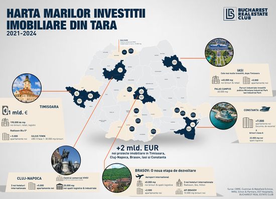 Timisoara atrage aproape 1 miliard de euro investitii, aproximativ jumatate din totalul investitiilor regionale, in proiecte de birouri, retail si logistice de peste 190.000 de mp, un hotel de 5 stele Radisson Blu si peste 5.000 de apartamente ce vor fi livrate pana in 2024, conform analizei BREC. Dintre cele 5 regiuni analizate, Timisul atrage cele mai mari investitii imobiliare datorita conexiunii excelente cu coridoarele pan-europene, fapt ce a a transformat zona intr-o locatie strategica pentru facilitati de productie. Grupul Iulius are aici in lucru unul dintre cele mai importante proiecte de birouri, UBC 0, cu 30.000 mp, iar AFI Europe si-a adaugat anul trecut in portofoliu proiectul AFI Park Timisoara. Totodata, marii investitori in logistica, CTP, WDP, VGP si Global Vision sunt prezenti cu proiecte in lucru de peste 115.000 mp.