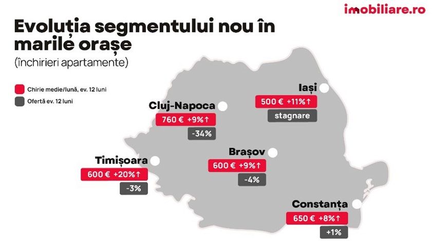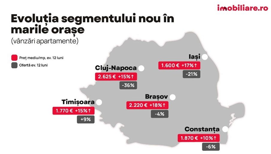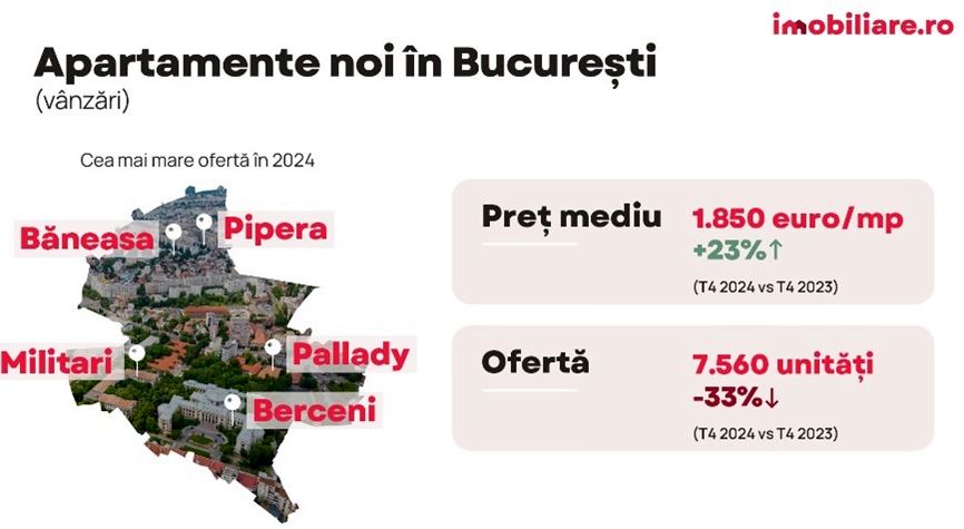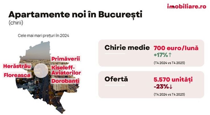 Preturile pentru noile locuinte inregistreaza cresteri considerabile in 2024, conform unei analize Imobiliare.ro prezentate in cadrul TRENDS FORUM organizat de Bucharest Real Estate Club (BREC) & Romania Property Club (RPC), cele mai mari asociatii ale industriei imobiliare. In Bucuresti, la nivelul ultimului trimestru, datele arata o crestere de 23% a preturilor de vanzare solicitate (pret mediu de 1.850 EUR, TVA inclus), in timp ce oferta scade cu 33%. In ceea ce priveste inchirierile, oferta este in scadere cu 23% iar chiria media lunara pentru locuinte noi (700 de euro) are un plus de 17%.