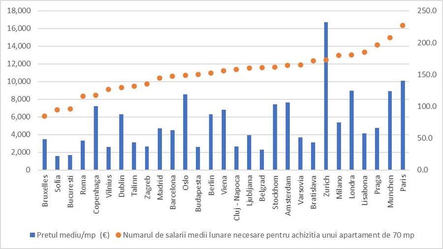 Bucuresti este printre orasele europene cu cele mai scazute preturi ale locuintelor si cu cele mai ridicate niveluri ale accesibilitatii achizitionarii acestora, dupa cum arata datele companiei de consultanta imobiliara Cushman & Wakefield Echinox. Cresterile preconizate ale salariilor pe fondul unei evolutii economice pozitive, dar si a relaxarii conditiilor de finantare, vor favoriza majorarea preturilor locuintelor in perioada urmatoare, tendinta pe care o vom vedea cel mai probabil manifestandu-se mai accentuat incepand cu anul viitor.Astfel, pe baza datelor publice privind pretul mediu solicitat pentru un apartament de 70 de metri patrati in Europa, nivelul de accesibilitate al achizitionarii unui astfel de apartament in Bucuresti este printre cele mai ridicate atat la nivel national, cat si European, fiind necesare 96,2 salarii medii nete lunare. Graduri mai ridicate de accesibilitate sunt inregistrate doar in Bruxelles si Sofia (84,2 si 94,3 salarii medii nete din orasele respective) dintre marile orase si capitale europene. La polul opus se situeaza Londra, Munchen, Paris sau Zurich unde preturile medii pe metro patrat util pot depasi sau chiar depasesc 10.000 euro (Paris) sau 16.000 euro (Zurich), fiind necesare in anumite cazuri mai mult de 200 salarii medii nete din respectivele locatii, un nivel mai mult decat dublu comparativ cu cel din Bucuresti.