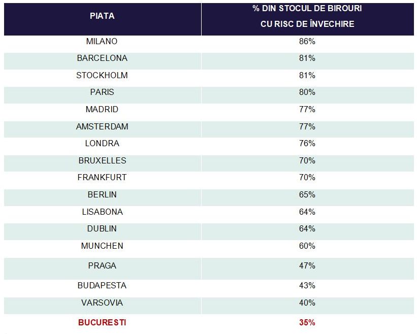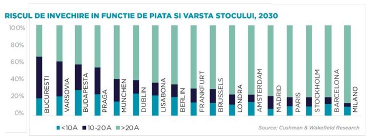 Pe de alta parte, pietele din Europa Centrala si de Est - Bucuresti, Budapesta, Praga si Varsovia, prezinta riscuri mai mici de invechire, cu un procent mediu de doar 43%. Acest lucru reflecta faptul ca o mare parte din stocul construit in aceste piete a fost livrat in ultimele doua decenii. In aceasta perioada, stocul de birouri din pietele din regiune s-a dublat, in timp ce in pietele din Vest, cresterea a fost de sub 20%.
