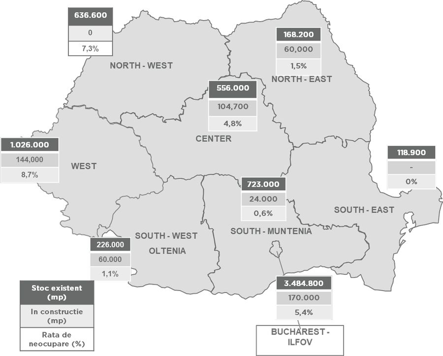 Stocul spatiilor industriale si de logistica a depasit borna de 7 milioane de metri patrati, aproape 80% din suprafata fiind concentrata in 3 regiuni de dezvoltare – Bucuresti - Ilfov, Vest, Sud - Muntenia. In 2023 au fost livrate proiecte noi totalizand 450.000 metri patrati, reprezentand o scadere de 46% fata de 2022, contractie care are la baza o activitate incetinita in ceea ce priveste spatiile construite speculativ, potrivit datelor companiei de consultanta imobiliara Cushman & Wakefield Echinox. Pentru acest an, dezvoltatorii au anuntat livrarea a peste 500.000 metri patrati reprezentand parcuri logistice si industriale noi, cea mai mare suprafata fiind anuntata in Bucuresti – Ilfov (180.000 metri patrati), in zona de Vest (144.000 metri patrati) si in Centru ( 105.000 metri patrati).