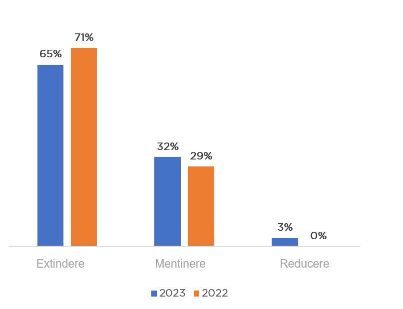 Majoritatea respondentilor (75%) prevad mai multe dezvoltari pe segmentul industrial si logistic, in timp ce 19% se asteapta la noi investitii in proiecte de retail. Ambele segmente au inregistrat o crestere a interesului in 2023.