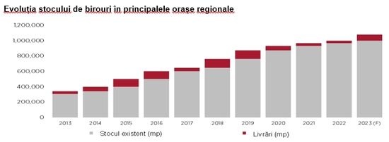 Cluj-Napoca ramane principalul hub regional de birouri, cu un stoc la finele anului trecut de 340.000 metri patrati, urmat de Timisoara cu proiecte de 293.000 metri patrati, Iasi cu 213.000 metri patrati si Brasov cu 152.000 metri patrati. In cele patru orase, stocul a ajuns astfel la circa milion de metri patrati, reprezentand mai putin de o treime din suprafata de birouri din Bucuresti.
