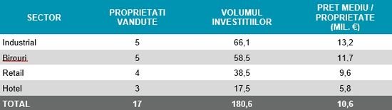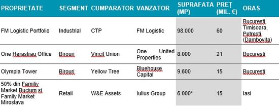 In ceea ce priveste segmentul de birouri, Vincit Union a achizitionat One Herastrau Office pentru 21 milioane euro, in timp ce Yellow Tree a devenit proprietarul cladirii Olympia Tower pentru care a platit aproximativ 15 milioane euro, ambele active fiind situate in Bucuresti. Cea mai relevanta tranzactie pe segmentul de retail a implicat vanzarea de catre Iulius Group a unei participatii de 50% din centrele comerciale Family Market din Iasi catre W&E Assets pentru aproximativ 15 milioane euro.
