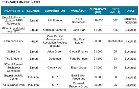 Cele mai mari sase tranzactii au fost reprezentate de proiecte de birouri, inclusiv vanzarea portofoliului local de birouri al NEPI Rockcastle catre AFI Europe. Tranzactia a implicat patru cladiri din Bucuresti si Timisoara cu o suprafata totala de 118.000 mp inchiriabili, ce au fost vandute pentru 307 milioane de euro, cea mai mare tranzatie de birouri semnata vreodata in Romania.