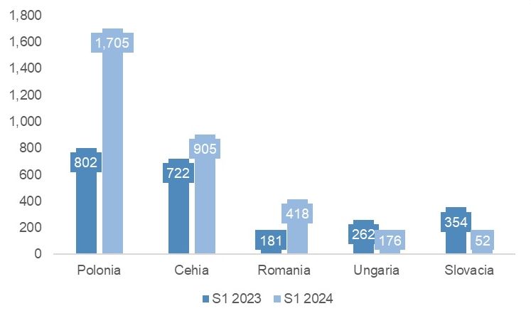 In Romania, in primul semestru al anului au fost consemnate 38 de tranzactii, comparativ cu 17 in S1 2023, conform datelor centralizate in raportul Romania Investment Marketbeat, lansat de compania de consultanta imobiliara Cushman & Wakefield Echinox.