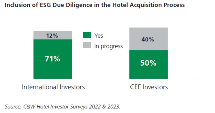 Studiile Cushman & Wakefield arata ca jumatate dintre investitorii hotelieri din ECE se uita la criteriile ESG in procesele de due diligence pentru achizitiilor unor proprietati hoteliere, iar 40% sunt in proces de includere a acestora in analizele lor.