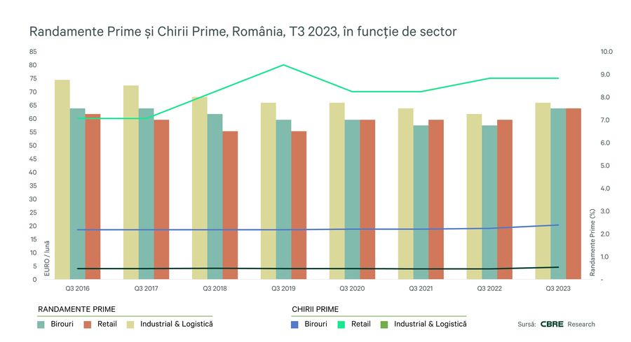 In prezent, randamentul de baza se situeaza la 7,5%, cu o variatie anticipata a randamentului investitional de 75 de puncte de baza (bps). Cu o chirie de 20,25-euro pe metru patrat, cresterea anuala se situeaza la aproximativ 6%. Volumul investitiilor pe segmentul de birouri din Romania a atins 15 milioane de euro in T3 2023, cu un total estimat de aproximativ 69 de milioane de euro pentru anul in curs.