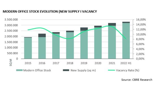 In ceea ce priveste cererea, domeniul Computers & Hi-Tech este lider de piata, cu 32% din suprafata totala inchiriata in primele sase luni ale anului 2022, urmat de domeniile Consumer Services & Leisure (16%) si Professional (15%).La finalul T2, stocul de spatii de birouri moderne din Bucuresti a inregistrat o rata de neocupare de 13,9%, similara cu cea de la sfarsitul trimestrului precedent. Analizand exclusiv cladirile de birouri clasa A, rata de neocupare scade la 11,7% in T1 2022.