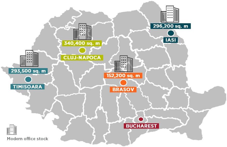 In Cluj - Napoca se inregistreaza cea mai scazuta rata de neocupare (6,2%), in vreme ce in Timisoara 10,7% din stoc este neinchiriat, in Brasov 11,8%, in Iasi fiind vacanta circa 20,4% din suprafata de birouri, cea mai mare parte in cladiri de clasa B.