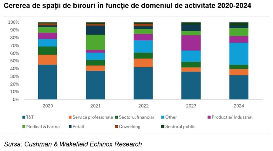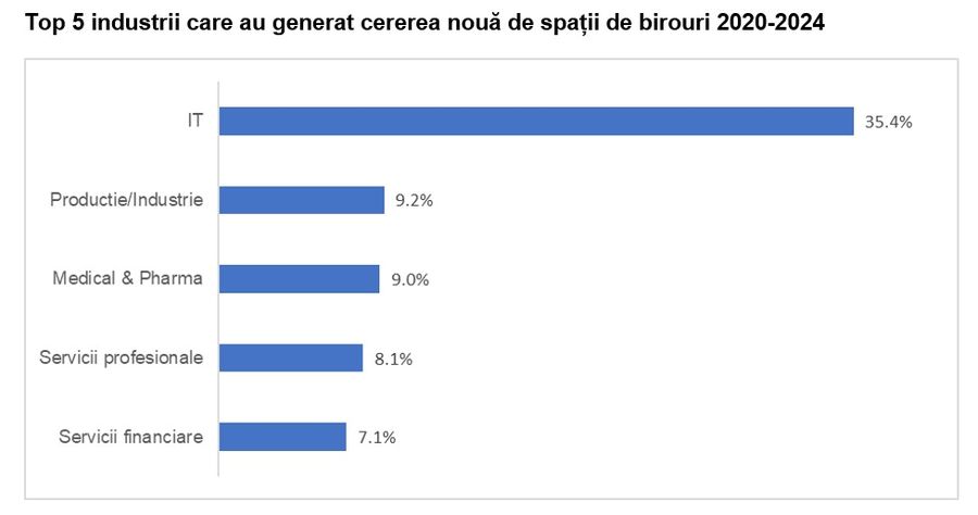 Companiile din IT, cele din domeniul productiei si industriei, precum si firmele din domeniul medical si farmaceutic au fost cele mai active pe piata inchirierii de birouri in ultimii cinci ani, generand peste jumatate din cererea de spatii noi de birouri, arata datele companiei de consultanta imobiliara Cushman & Wakefield Echinox.In total, intre 2020-2024, suprafata neta inchiriata (excluzand contractele de renegociere) de spatii de birouri in Bucuresti si in principalele orase regionale - Cluj-Napoca, Timisoara, Iasi si Brasov - a fost de circa 1,06 milioane de metri patrati. Aceasta suprafata este comparabila cu stocul total de birouri din cele patru orase regionale sau cu 30% din stocul existent in Bucuresti.