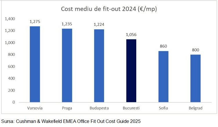 Cu toate acestea, Bucurestiul, cu un pret mediu estimat de 1.056 euro/ mp pentru fit-out complet, incluzand toate lucrarile de amenajare pentru toate specialitatile, inclusiv sistemul de management al cladirii - BMS, mobilier, echipamente audio-video, servicii profesionale (management de proiect, SSM si dirigentie de santier) si cheltuieli neprevazute, ramane o piata competitiva in raport cu alte capitale din regiune.