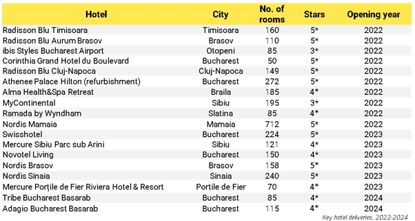 Lista continua cu Novotel Living, un aparthotel programat sa isi deschida portile in 2023. ibis Styles Bucharest Airport, din Otopeni, este cea mai noua aditie la stocul hotelier al Bucurestiului in 2022. La nivel national, viitorul apropiat va nota extinderi ale unor branduri existente, precum Mercure in Sibiu, Brasov si Portile de Fier, Radisson in Cluj-Napoca sau Ramada in Slatina.