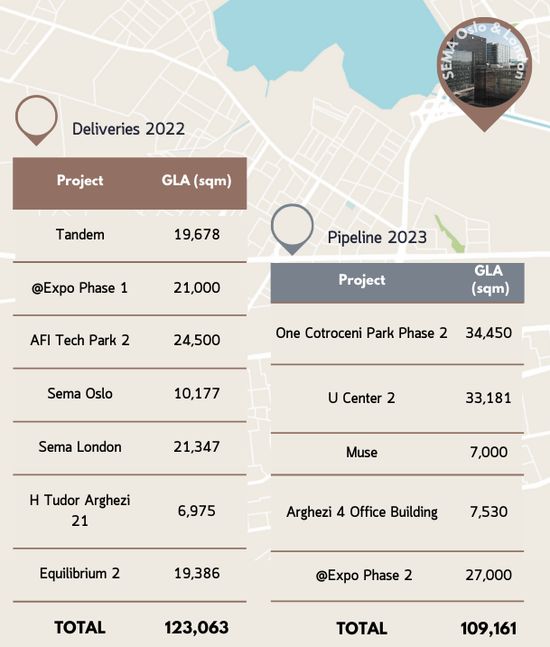 La finalul lunii martie 2023, stocul de birouri din Bucuresti era de 3,75 milioane de metri patrati, cu 123.000 mp in sapte cladiri de birouri livrate in 2022 si alti 42.000 mp in doua cladiri adaugati in primul