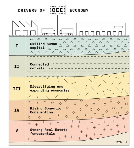 Regiunea Europei Centrale si de Est a dat dovada de o rezistenta economica puternica, cresterea PIB-ului real fiind mai mare decat cea a pietelor din Europa de Vest si a intregii Europe. Se preconizeaza ca in perioada 2023-2026 cresterea PIB-ului CEE va fi de doua ori mai rapida decat media zonei euro. O baza manufacturiera puternica, impreuna cu sectoarele in crestere din zona Inovatiei, precum si piata fortei de munca calificate din CEE si proximitatea fata de Europa de Vest inseamna ca regiunea devine rapid un hotspot de "nearshoring", ceea ce determina o cerere suplimentara de spatii industriale si logistice.