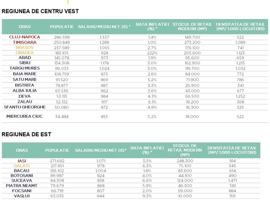 La nivel de oras, localitatile cu cea mai mare densitate de spatii comerciale sunt Pitesti (1.510 mp/ 1.000 locuitori), Suceava (1.471 mp/ 1.000 locuitori), Deva (1.252 mp/ 1.000 locuitori), Sibiu (1.213 mp/ 1.000 locuitori), Oradea (1.123 mp/ 1.000 locuitori) - orase cu pana la 150.000 de locuitori si Timisoara (1.089 mp/ 1.000 de locuitori) - oras primar cu o populatie de peste 250.000 de locuitori.