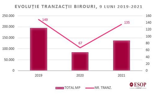 In total , in primele noua luni din 2021 s-au realizat 135 de tranzactii cu spatii de birouri, in timp ce in 2020, in aceeasi perioada din 2019 s-au incheiat doar 67 de tranzactii in Bucuresti. Comparativ cu 2019 si 2018, anii anteriori pandemiei, in acest an avem inca un numar mic de tranzactii si un volum mai mic de spatii. In 2019, inainte de declansarea pandemiei COViD 19, in primele noua luni se realizasera 149 tranzactii, cu un total de aproape 200.000 mp.