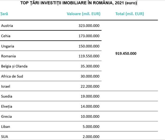 Austria se afla pe primul loc in topul investitorilor care au ales proprietati imobiliare comerciale in Romania anul trecut, cu circa o treime din achizitii, conform Fortim, membra a Aliantei BNP Paribas Real Estate. Pe locurile doi si trei se afla Cehia si Ungaria.In 2021, companiile austriece au cumparat active imobiliare - birouri si spatii de retail in valoare totala de 323 milioane de euro, pe locul doi fiind investitorii din Cehia, cu un total de 173 milioane de euro si pe locul trei cei din Ungaria, cu 150 milioane de euro. In primele luni ale acestui an, investitorii cehi si maghiari au ramas in top.