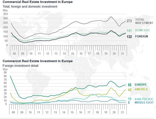 Investitiile imobiliare straine au fost afectate de raspandirea virusului in Europa, in primul rand ca derulare in timp. In primavara anului 2020, majoritatea investitorilor straini si-au amanat tranzactiile in curs pana cand Europa va fi redeschisa. Pe parcursul celor douasprezece luni pana in T1 2021, investitiile straine au scazut (-38% fata de T1 2020), dar apoi situatia s-a imbunatatit in restul anului 2021.