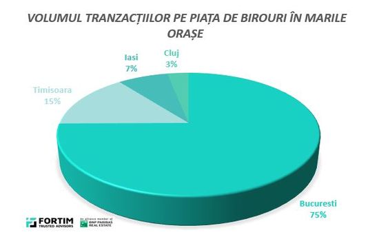 Cea mai mare piata de birouri moderne a fost in Bucuresti, unde companiile au inchiriat 75% din totalul spatiilor de birouri tranzactionate, in primul trimestru al anului, conform unui studiu realizat de Fortim Trusted Advisors, membra a Aliantei BNP Paribas Real Estate. Restul tranzactiilor office s-au inregistrat in Timisoara, Iasi si Cluj Napoca.In total, in Romania,75 de companii au inchiriat suprafete ce insumeaza 42.906 mp de spatii noi, din care 32.116 mp in Bucuresti, in primul trimestru din 2023.