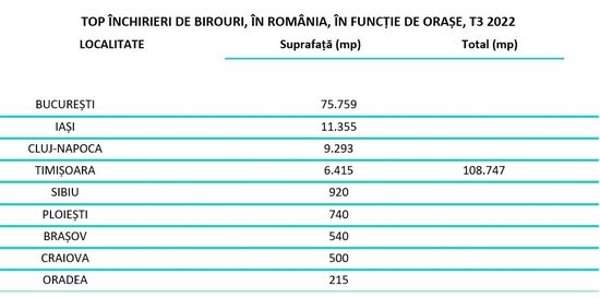 La nivelul intregii tari, in ultimele trei luni, companiile au inchiriat birouri moderne cu o suprafata totala de 108.747 mp, atat birouri noi, cat si prelungiri de contracte, in crestere cu 9% fata de trimestrul similar din 2021, conform unei analize realizate de Fortim Trusted Advisors, membra a Aliantei BNP Paribas Real Estate. Meritul acestei cresteri la nivelul Romaniei nu ii revine insa Bucurestiului, unde a scazut cererea de birouri noi, ci marilor orase precum Iasi, Cluj-Napoca si Timisoara.La nivelul tarii, orasele mari au o pondere din ce in ce mai mare in totalul inchirierilor de birouri, in defavoarea Capitalei. In Bucuresti s-au inchiriat, pre-inchiriat si prelungit contracte pentru o suprafata totala de birouri de circa 75.700 mp, in timp ce in Iasi de 11.355 mp, in Cluj-Napoca de 9.293 mp si in Timisoara de 6.415 mp.