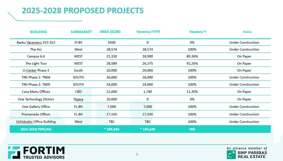 In 2024 nu a fost livrata nicio cladire de birouri pana in acest moment si este posibil sa se livreze o singura cladire de mici dimensiuni, pana la finalul anului, remarca Nicolae Ciobanu, Managing Partner - Head of Advisory, Fortim Trusted Advisors, membru in Alianta BNP Paribas Real Estate. Situatia de pe piata office se va redresa, insa, in anii urmatori, pentru perioada 2027-2028 fiind planificata livrarea a cel putin 11 cladiri de birouri, proiecte noi sau extinderi ale celor existente, cu o suprafata totala de aproape 200.000 mp. "In anii anteriori, chiriasii care doreau sa-si mute spatiile de birouri luau in considerare in primul rand cladirile in constructie, unde isi puteau personaliza spatiile cu mult inainte de mutare. Aceste oportunitati aproape au disparut, in acest moment, existand doar o singura cladire de birouri in constructie, AFI Loft, cu o suprafata de 16.500 mp.