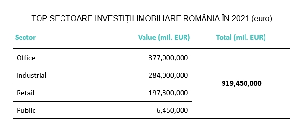 “Anul 2021 a fost un an excelent pe piata investitiilor imobiliare din Romania, cu un total de 919,45 mil euro, in conditiile in care in anul 2020 s-au realizat tranzactii de 884,6 mil euro, iar in 2019 de 714,2 mil euro. In topul segmentelor de piata pentru care si-au aratat interes investitorii, in 2021, pe primul loc se situeaza cladirile cu destinatie de birouri, pe locul doi segmentul industrial, pe locul trei retailul (malluri si centre comerciale), pe locul patru domeniul hotelier si pe ultimul loc sectorul public“ declara Nicolae Ciobanu, Managing Partner- Head of Advisory Fortim Trusted Advisors, membra a Aliantei BNP Paribas Real Estate.