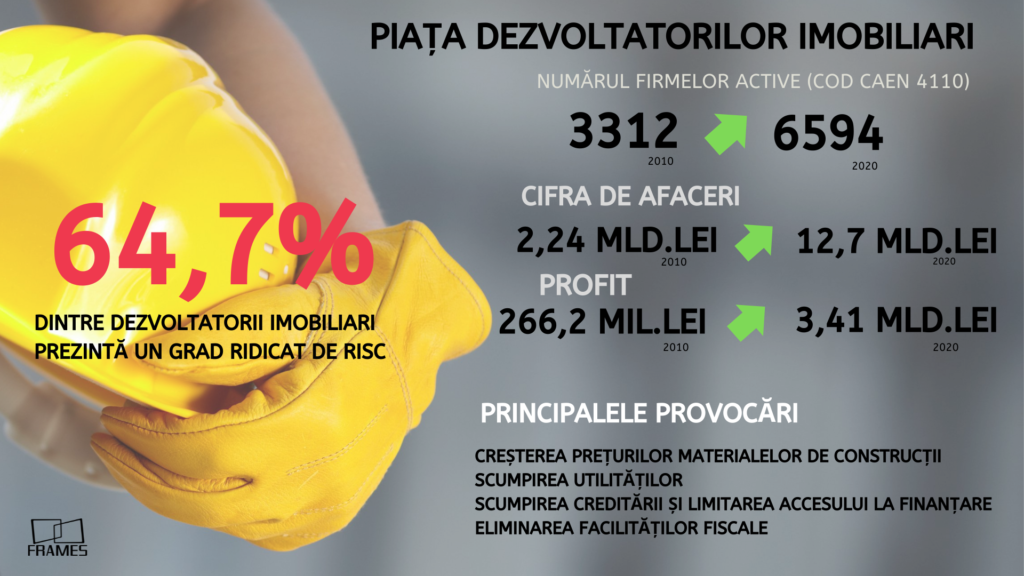 Analiza Frames a fost realizata pe baza datelor oficiale comunicate de companiile cu codul CAEN 4110 (dezvoltarea proiectelor de constructii, pentru cladiri rezidentiale si nerezidentiale, prin reunirea mijloacelor financiare, tehnice si fizice pentru realizarea proiectelor de constructii in vederea vanzarii ulterioare). Analiza a luat in calcul un numar de 6594 de firme, dintre care 6394 in functiune, 15 in insolventa si 79 cu datorii la stat.