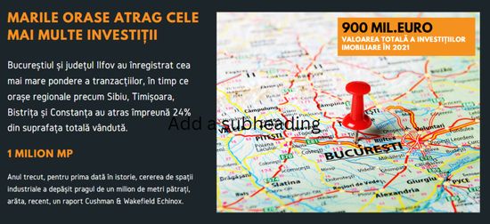 In 2021, valoarea totala a investitiilor imobiliare s-a apropiat de 900 de milioane de euro in Romania in 2021, potrivit consultantilor Colliers Romania, iar spatiile industriale si logistice au reprezentat 29% din total.
