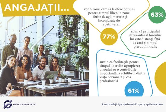Revenirea la birou si definirea modului de lucru din viitor a schimbat perceptiile angajatilor despre biroul lor. Romanii isi doresc birouri unde sa aiba optiuni de socializare si interactiune atat la job, cat si in timpul liber, o tendinta tot mai vizibila si la nivel global. Astfel, pentru 77% dintre angajatii romani, biroul ideal trebuie sa se afle intr-o zona inconjurata de spatii verzi, care sa le ofere facilitati pentru timpul liber, arata un sondaj initiat in 2022 de Genesis Property in randul a 1.180 de angajati din toata tara.Pentru aproape 63% dintre angajati, un parc sau o zona verde unde pot lua o pauza este principalul beneficiu pe care si-ar dori sa-l aiba in apropierea biroului, in timp ce alti 51% plaseaza pe primul loc accesul la zone dedicate pranzului si intalnirilor informale cu colegii. In acelasi timp, 38% vor spatii versatile unde sa poata interactiona si socializa atat in timpul orelor de lucru, cat si in timpul liber. In prezent, doar 4 angajati din 10 au un spatiu verde in apropierea biroului si 3 angajati din 10 au acces la zone unde pot interactiona si socializa.