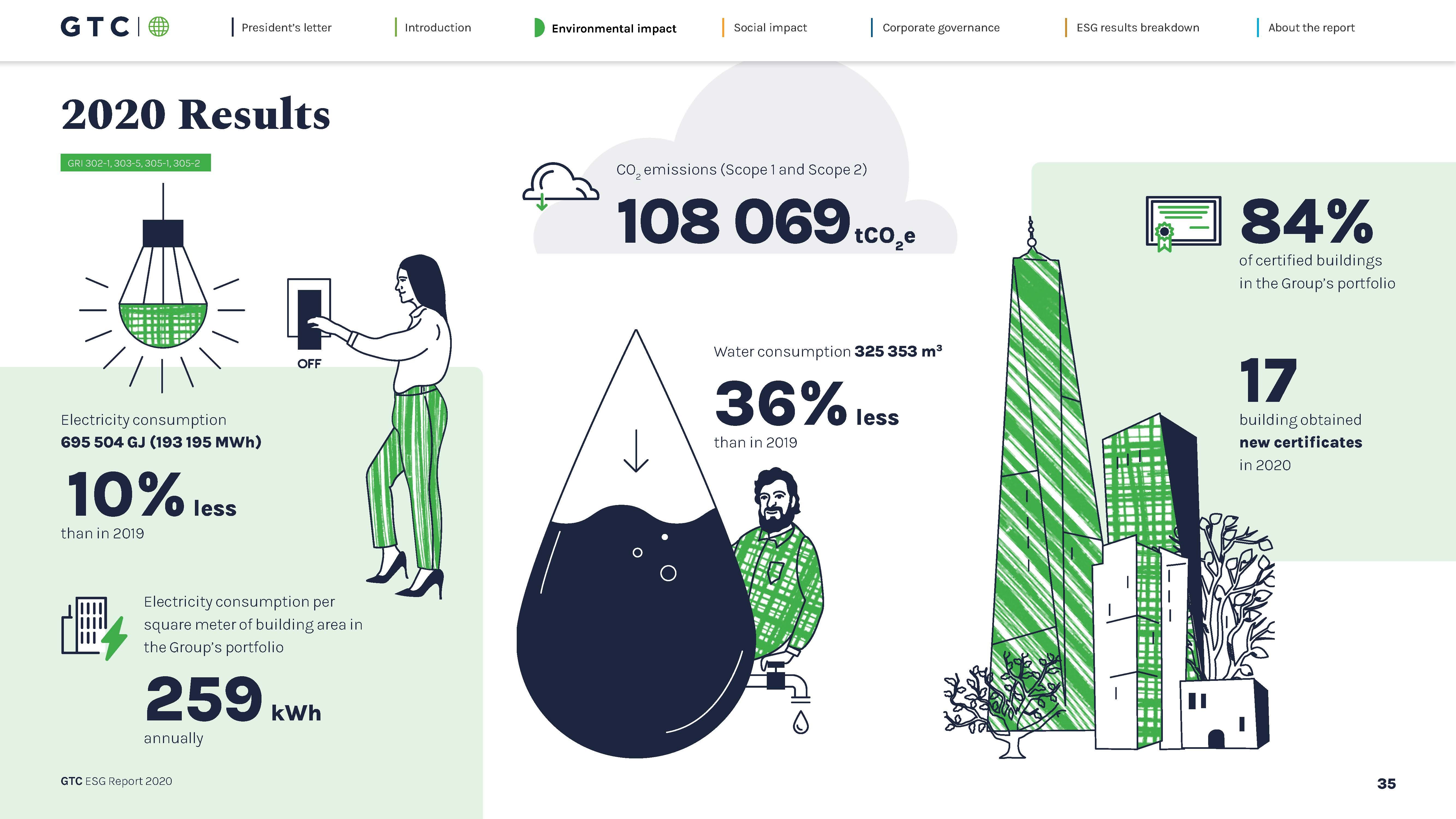 Raportul prezinta date despre performanta GTC in toate pietele - Polonia, Ungaria, Serbia, Croatia, Bulgaria si Romania. O atentie deosebita este acordata pandemiei provocate de COVID-19, deoarece anul 2020 a reprezentat o adevarata provocare, ce a testat relatiile chirias-dezvoltator. Cu toate acestea, GTC si-a dovedit priceperea in afaceri si a demonstrat ca responsabilitatea sociala este parte integranta a strategiei Grupului, indiferent de circumstante. Datorita abordarii ce pune locatarul in prim-plan, indicatorii cheie de performanta ai GTC au ramas la un nivel satisfacator si, pana la sfarsitul anului 2020, dezvoltatorul a putut inregistra, printre altele, un procent foarte bun al spatiilor de birouri inchiriate. Prin angajarea intr-un dialog eficient si prin ajustarea operatiunilor la realitatea in continua schimbare provocata de pandemie, GTC a reusit sa mentina un grad de ocupare ridicat si in mall-urile sale, prin actiuni de vanzare pentru inchirierea de noi magazine. In plus, pentru prima data in istoria Grupului, doua cladiri, Globe Trade Center S.A. si GTC Real Estate Development Hungary Zrt, au primit un rating de investitii de BBB- / cu o perspectiva stabila.