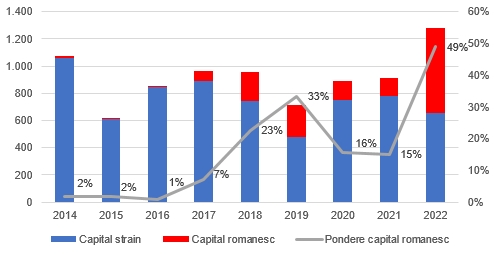 Evolutia ponderii capitalului romanesc in total volum tranzactionat (2014-2022)