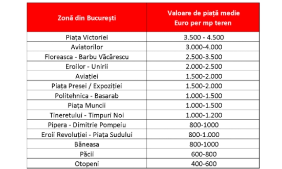 Din analiza preturilor terenurilor, in cele mai cerute zone de dezvoltare pe piata rezidentiala, au rezultat valori intre 400 si 800 Euro, la periferie (Otopeni, Pacii), si 3.500 - 4.500 Euro pentru mp de teren in centrul Capitalei (Piata Victoriei si Aviatorilor).