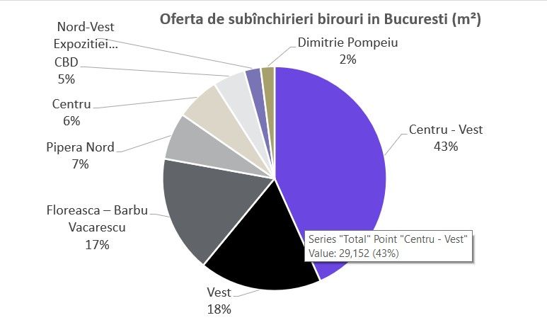 Acest lucru a declansat in 2023 o disponibilitate ridicata de spatii la subinchiriere in sub-pietele de birouri Centru-Vest si Floreasca-Barbu Vacarescu, urmata de sub-piata de birouri Vest, unde sunt concentrate majoritatea sectoarelor mentionate anterior. A fost o provocare pentru dinamica pietei si pentru proprietari, dar in acelasi timp a oferit mai multe oportunitati pentru chiriasii in cautare de spatiu.