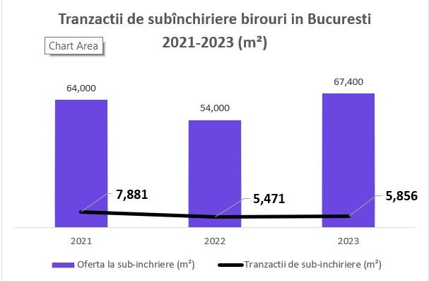 In ciuda acestei oferte consistente, doar pana la 12% din spatiile ofertate la subinchiriere au fost tranzactionate in 2021, acest nivel scazand si mai mult in 2022 si 2023.