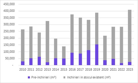 Grafic 1: Evolutia ponderii pre-inchirierilor in cererea totala (bruta) de spatii de birouri in BucurestiMinimul istoric al pre-inchirierilor a fost atins in 2022, respectiv cu putin peste 15.000 mp, reprezentand o pondere de doar 5,3% din cererea totala. Situatia nu s-a schimbat nici in 2023, cand pre-inchirierile au totalizat 23.600 mp si au reprezentat 5,8% din cererea totala.