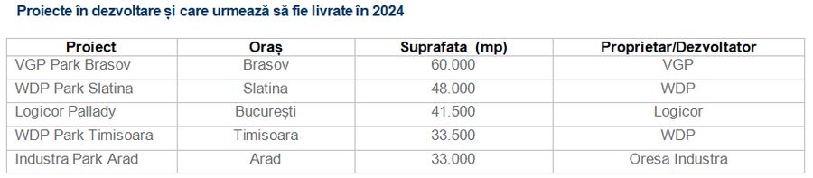 Dezvoltatorii au in constructie proiecte totalizand 500.000 de metri patrati in diverse orase din tara. Bucurestiul, Timisoara si Brasov sunt destinatiile preferate pentru dezvoltatori, circa 50% din proiectele care urmeaza sa fie livrate fiind localizate in aceste hub-uri logistice, in timp ce Slatina, Arad si Sibiu vor beneficia de asemenea de spatii noi semnificative.