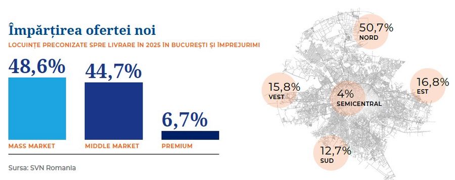 Cele mai multe locuinte care ar urma sa fie finalizate in 2025 in Bucuresti si imprejurimi, adica aproximativ 48,6% din oferta noua, se adreseaza segmentului mass market. Locuintele care tintesc segmentul middle market vor detine o pondere estimata la circa 44,7%, in crestere de la aproximativ 36,4% in 2023. Concomitent, proiectele premium si de lux vor detine o cota de aproximativ 6,7% din oferta noua.