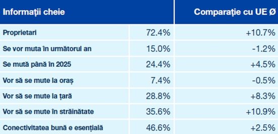 O mare parte din romani sunt proprietarii locuintelor lor (72%), cu peste 10% peste media europeana. Dintre cei care iau in calcul o posibila mutare, 15% isi popun sa faca acest lucru in urmatorul an, iar cca. 25% in urmatorii trei ani. Aprox. 29% din acestia au afirmat ca isi doresc sa se mute la tara. Cu toate acestea, majoritatea (54%) planuiesc sa ramana in zona urbana. Este adevarat si faptul ca 35,6% din respondentii romani nu ar exclude o mutare in strainatate, unul din cele mai mari procente din Europa, depasit doar de Turcia la (45%).