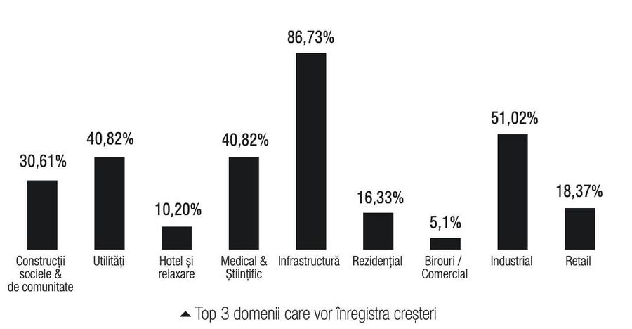 Constructorii din Romania mizeaza in special pe lucrarile publice ca motor de crestere in acest an: infrastructura - 86%, Medical - 40%, la egalitate cu lucrarile reprezentate de utilitati si constructii sociale (30%).