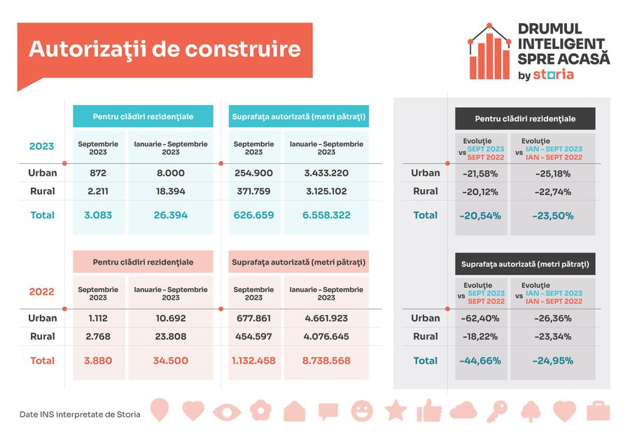 Intre timp, Institutul National de Statistica (INS) a publicat datele cu privire la numarul autorizatiilor de construire acordate la nivel national in primele noua luni ale anului. Cu exceptia unor semnale pozitive din partea mediului rural, toate datele indica scaderi la acest capitol.