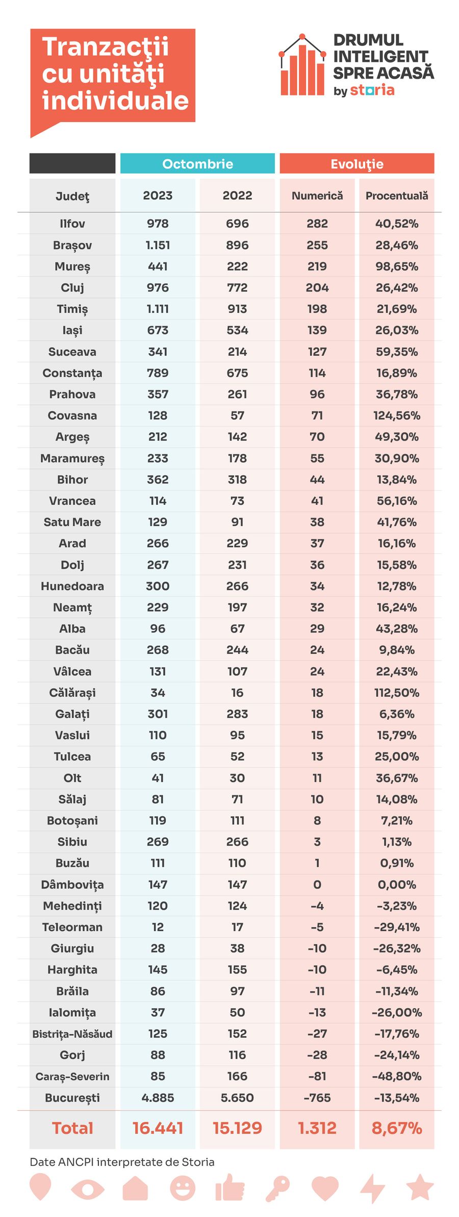 Intre timp, Brasov continua sa inregistreze cresteri semnificative la acest parametru, dupa ce a inregistrat a patra luna consecutiva de cresteri. Cele 1.151 tranzactii din octombrie echivaleaza cu o crestere cu 26,3% comparativ cu septembrie 2023 si cu 28,5% fata de octombrie 2022. Acestea sunt, de altfel, si cele mai mari cresteri procentuale in randul principalelor judete din Romania.