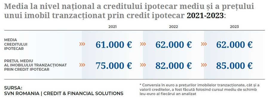 Valoarea medie a unui credit ipotecar acordat la nivel national in 2023 a fost de circa 62.000 de euro, in timp ce pretul mediu la nivel national al unui imobil tranzactionat prin credit ipotecar in 2023 a fost de 85.000 de euro, in crestere de la 82.000 de euro in 2022, potrivit calculelor companiei. In total, anul trecut au fost acordate aproximativ 48.000 de credite ipotecare noi, comparativ cu un nivel de aproximativ 55.000 de credite ipotecare noi acordate in 2022.