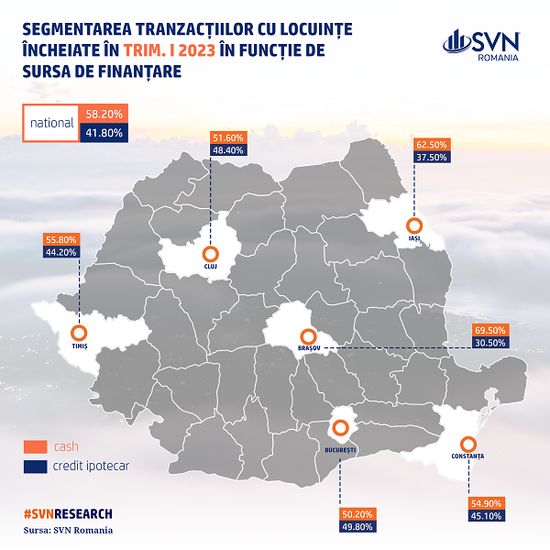 Peste 58,2% dintre locuintele vandute in Romania in primul trimestru din 2023 au fost cumparate cu fonduri provenind exclusiv din resurse proprii, fara a se apela la o finantare ipotecara, releva un raport realizat de catre compania de consultanta imobiliara SVN Romania pe baza statisticilor Agentiei Nationale de Cadastru si Publicitate Imobiliara (ANCPI).Astfel, procentul locuintelor cumparate printr-un credit ipotecar la nivel national in primele trei luni din 2023 a fost de cel mult 41,8%, proportia fiind in realitate mai redusa, tinand cont ca totalul ipotecile intabulate in perioada amintita include si creditele de consum cu ipoteca si refinantarile ipotecare.