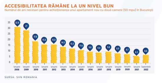 Astfel, in luna septembrie a acestui an erau necesare 103,8 salarii medii (8,6 ani) la nivel national pentru a cumpara un apartament nou cu doua camere (50 de metri patrati utili) in Bucuresti, comparativ cu 102,3 salarii medii (sau 8,5 ani) in septembrie 2021, marcand o depreciere de 1,5% in ultimele 12 luni marcate un context extrem de nefavorabil.