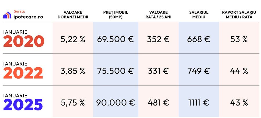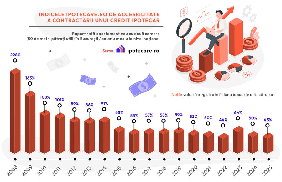 Rata medie a unui credit ipotecar contractat pe o durata de 25 de ani pentru cumpararea unui apartament nou cu doua camere (50 de metri patrati utili) in Bucuresti a ajuns la inceputul lui 2025 la o pondere de 43% din salariul mediu la nivel national potrivit indicelui Ipotecare.ro de accesibilitate a contractarii unei finantari ipotecare, aceasta fiind cea mai redusa valoare inregistrata in ultimele decenii.In calcularea raportului rata salariu a luat in calcul un pret mediu de 90.000 de euro, respectiv 1.800 de euro pe metrul patrat util, in crestere cu 11,8% fata de ianuarie 2024. Dobanda medie pentru creditele ipotecare acordate in luna ianuarie a acestui an in Bucuresti a fost de 5,79%, potrivit calculelor companiei de consultanta financiara SVN Credit Romania, rezultand astfel o rata lunara cu o valoare echivalenta a 481 euro. In acelasi timp, pentru luna ianuarie a fost luat in calcul un salariu mediu de 1.111 euro la nivel national – comparativ, salariul mediu inregistrat in luna decembrie 2024 a fost de 1.134 de euro potrivit datelor Institutului National de Statistica (INS).
