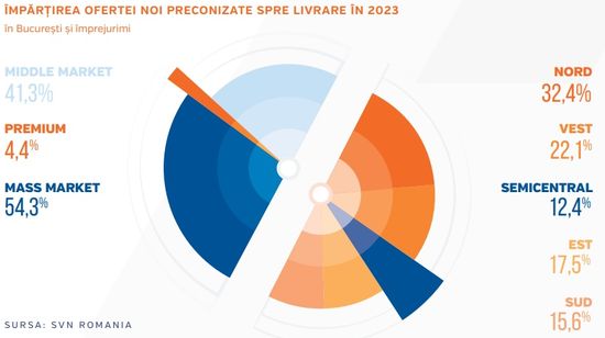 Structura ofertei noi nu va inregistra schimbari semnificative in 2023, mai releva raportul SVN Romania, aproximativ 54% din locuintele care ar urma sa fie finalizate in acest an in Bucuresti si imprejurimi tintind segmentul mass market. Concomitent, circa 41% din oferta noua din acest an tinteste segmentul middle market. Segmentul premium si de lux va inregistra in 2023 cele mai bune rezultate de livrari din ultimii ani, cu un nivel estimat la circa 800 de locuinte, sau aproximativ 4,4% din oferta noua.