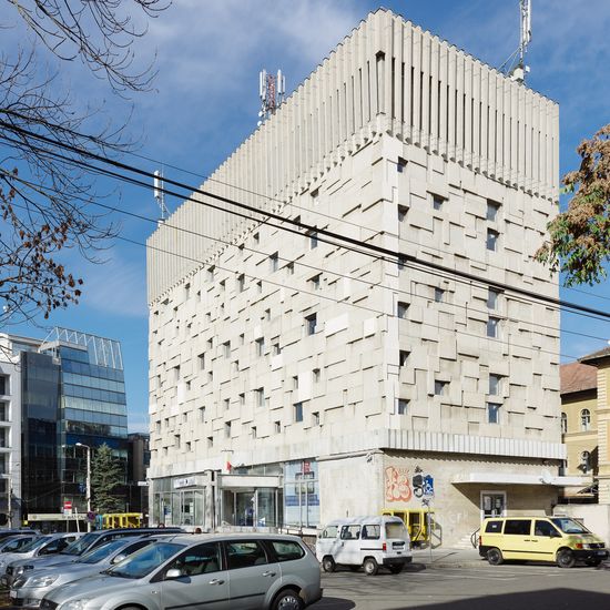 Palatul Telefoanelor, Cluj–Napoca. Palatul Telefoanelor este una dintre cladirile reprezentative ale Clujului, in ceea ce priveste stilul arhitectural al inceputului celei de a doua decade a secolului XX in Romania.Proiectat de arhitectul Vasile Mitrea in 1968, Palatul Telefoanelor a fost realizat in doua etape. In prima etapa (1969) s-a conceput un proiect de executie pentru s+p+5 din care s-au realizat doar s+p+3. La parter au fost amplasate spatiile destinate publicului (cabine telefonice, ghisee) si cele pentru administratie (birouri, arhiva). In cea de-a doua etapa s-a adaugat un etaj prin ridicarea cadrelor, turnarea planseului si inchiderea nivelului cu un invelis de sticla. Expresivitatea arhitecturala a fost castigata prin datele primare ale arhitecturii: volumul traforat cu goluri si materialul supus dialogului lumina-umbra.