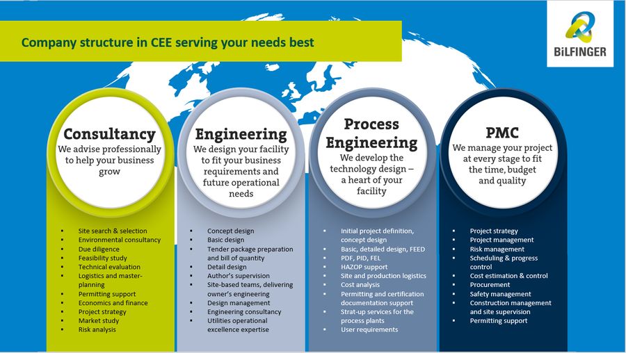 Bilfinger Tebodin are una dintre cele mai mari echipe de experti din Europa - consultanti, ingineri si directori de constructii, asa ca putem confirma ca aceasta tranzitie are loc in intreaga Europa Centrala si de Est. Cu know-how-ul nostru, putem sprijini aceste proiecte de la alegerea celei mai bune locatii, proiectare, inginerie si managementul constructiei, pana la punerea in functiune si predarea acesteia. Clienti de-ai nostri din Romania si CEE, precum cei activi pe zona de producere biocombustibili si prelucrare a otelulu, cauta din ce in ce mai mult o solutie complexa, in care tot sprijinul este oferit intr-o linie interconectata de servicii numita EPCM (inginerie, procurare si managementul constructiilor)", a mai subliniat George Cursaru.